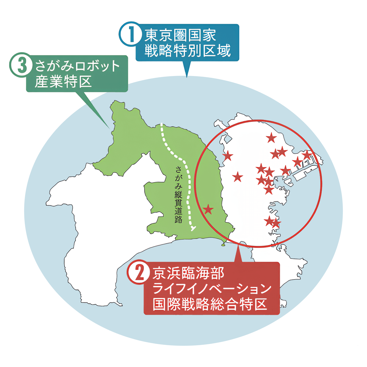 国が産業の国際競争力を高め、国際的な経済活動の拠点を創出するために、規制改革やその他の施策を重点的に進める特別な区域です。神奈川県全域がこの区域に指定されています。