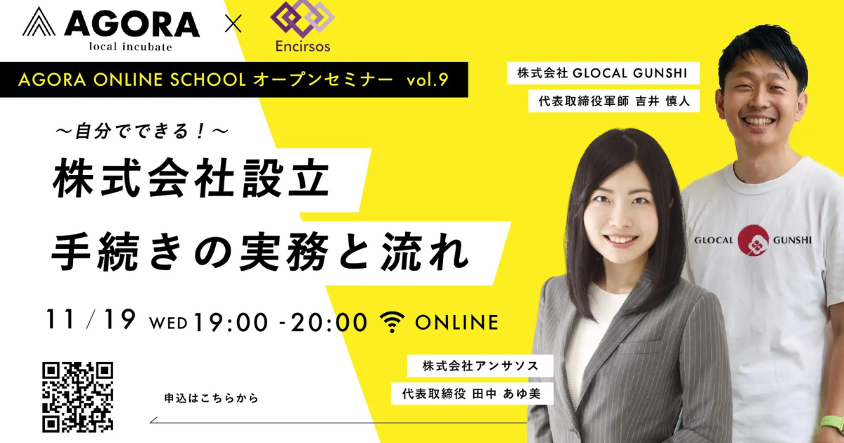 日時:2025年11月19日(水)19:00 – 20:00場所:オンライン(Zoom)参加費:無料対象:起業家の方、起業準備中の方、スタートアップ経営者の方、フリーランスの方内容:株式会社設立に必要な基礎知識/定款作成・認証の進め方/登記書類の作成/登記の申請/税務・社会保険関連手続きの仕方/質疑応答主催:株式会社AGORA