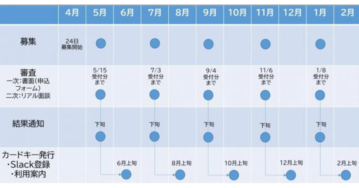 以降、隔月(9月・11月・1月)第1木曜日の17時15分を募集締切として、それまでの間に応募いただいた方の審査を行います。