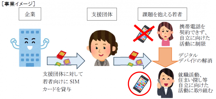 生活困窮やDV等により携帯電話を契約できず、自立に向けた活動が制限されている若者向けに、企業が支援団体に対してSIMカードを無償で貸与し、通信手段及び電話番号を確保することで、デジタルデバイドの解消を図ります。