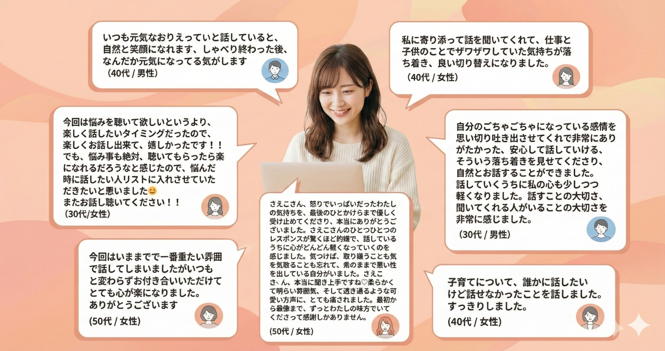 現在、1,000件に迫るレビューを通じて、「話すことで自分の強みに気づけた」「モヤモヤが晴れて前向きになれた」「ぐっすり眠れた」という声が多数寄せられています(レビューはコチラ)
