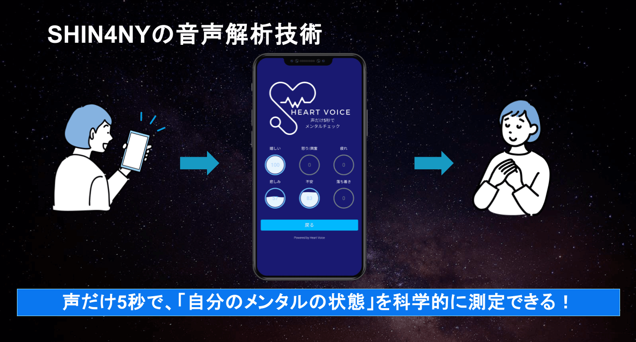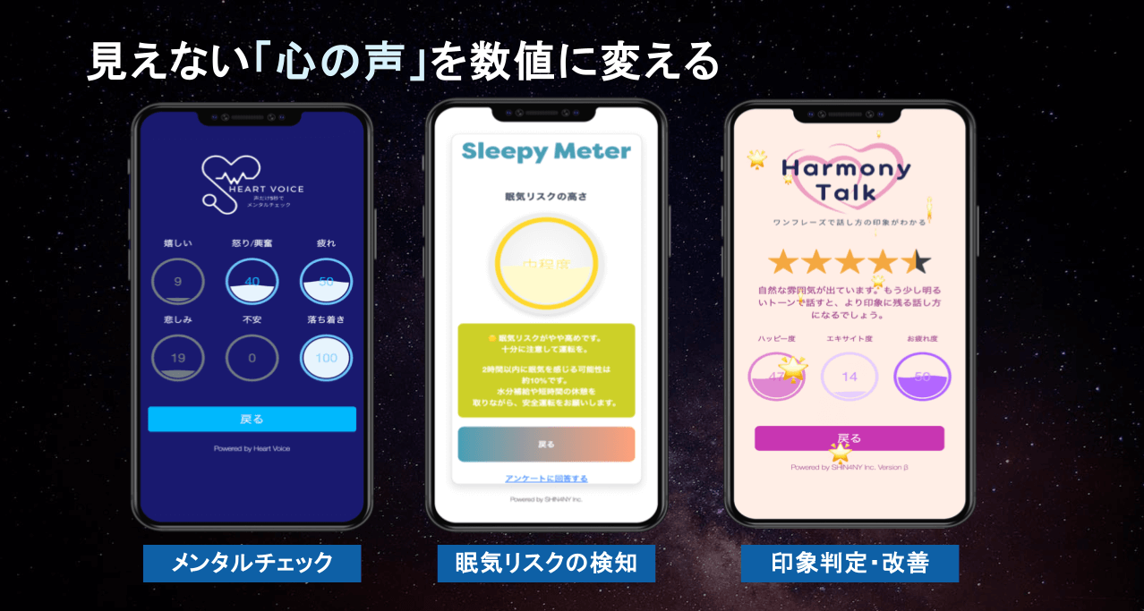だからこそ、体の症状や言葉として現れる前の、「黄色信号」の段階で客観的に状態を把握できる仕組みが必要だと強く思いました。SHIN4NYの技術は、まさにその課題を解決するためにあります。声という、誰もが無意識に発しているものから、本人さえ気づいていない心身の状態を見えるようにしたい。また、ネガティブな側面だけでなく、「ボルテージ指数」のように熱として伝わるポジティブな感情を可視化することは、より大きな熱量を生み出し、エンターテインメントにも活用できると考えています。