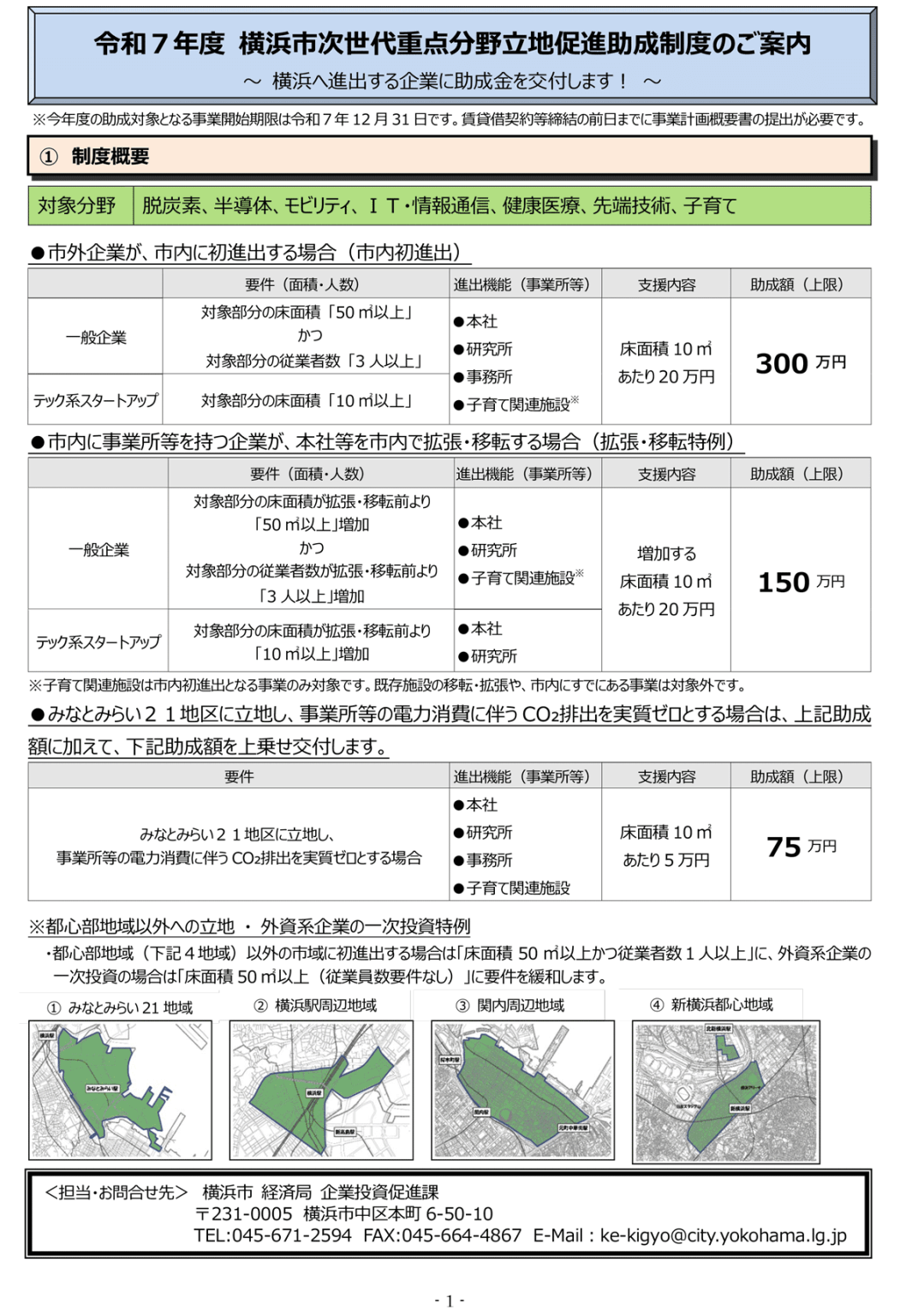 横浜経済の持続的成長に資する企業の立地を促進するとともに、イノベーションの創出が期待されるテック系スタートアップの集積を進めるため、本市が指定する分野の市外企業が横浜市内に初進出する場合、また、市内に事業所等を持つ企業が、本社等を市内で拡張・移転する場合に交付する「次世代重点分野立地促進助成金」の申請受付を開始します。